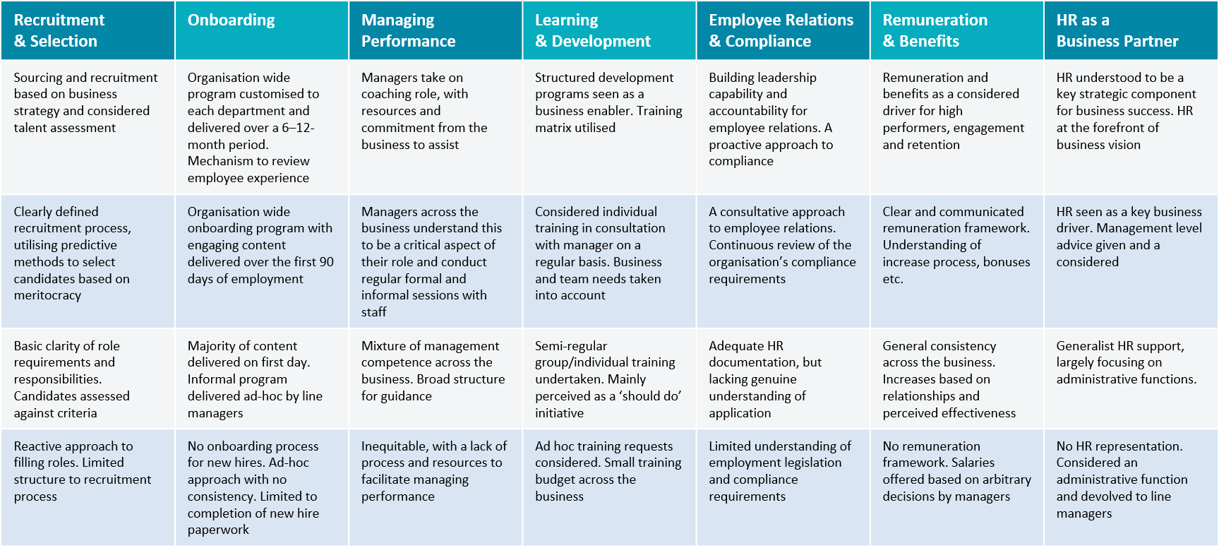 Utilising Liquid HR’s proprietary HR framework (click here to view) for small/medium sized businesses’, we will map your organisation’s current capability against our framework to assess your HR strengths and weaknesses.